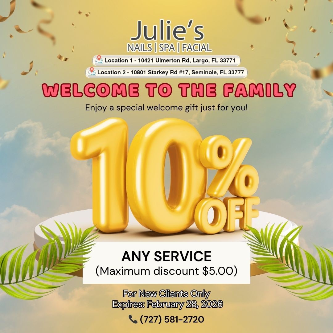 Our Commitment to Your Safety Your health is our absolute priority. We strictly follow the highest sanitation protocols by using hospital-grade sterilization for all metal equipment. To ensure a pristine experience, we use single-use buffers, files, and pedicure liners which are discarded after every client. At Julie's Nails & Spa, we take pride in maintaining a clean, safe, and welcoming atmosphere for every guest who walks through our doors.